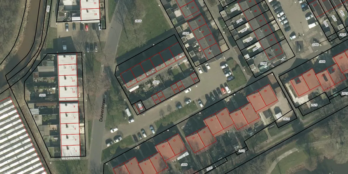 Duiventoren 46-c is gelegen op kadastraal perceel ODB02C1603. Deze kadastrale aanduiding is uniek en wordt gebruikt door het Kadaster om eigendomsrechten en andere zakelijke rechten vast te leggen. Het perceel maakt onderdeel uit van de kadastrale gemeente Oudenbosch.