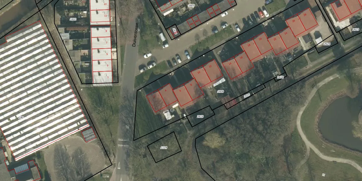 Het perceel waarop Duiventoren 6 staat heeft een oppervlakte van 3182 m². Dit is een zeer groot perceel. De perceeloppervlakte wordt geregistreerd door het Kadaster. Gedetailleerde informatie over de maten van dit perceel kunt u vinden in het rapport Kadastrale kaart met maatvoering van Duiventoren 6.