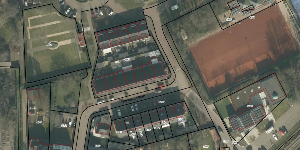 Het perceel waarop Franciscuslaan 21 staat heeft een oppervlakte van 1855 m². Dit is een zeer groot perceel. De perceeloppervlakte wordt geregistreerd door het Kadaster. Gedetailleerde informatie over de maten van dit perceel kunt u vinden in het rapport Kadastrale kaart met maatvoering van Franciscuslaan 21.