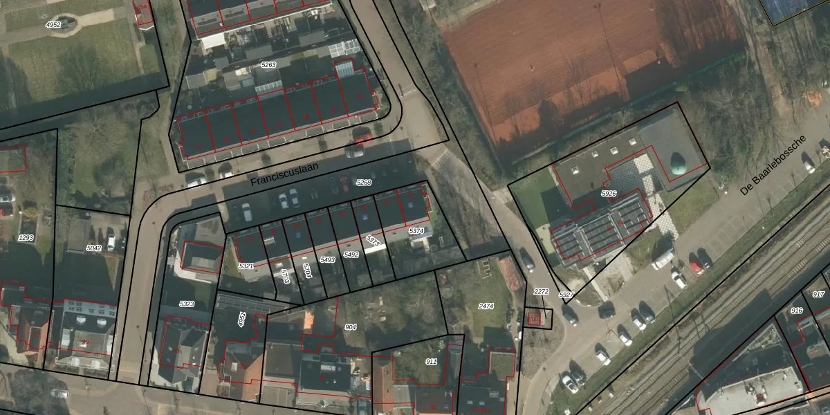 Franciscuslaan 24 is gelegen op kadastraal perceel ODB02B5374. Deze kadastrale aanduiding is uniek en wordt gebruikt door het Kadaster om eigendomsrechten en andere zakelijke rechten vast te leggen. Het perceel maakt onderdeel uit van de kadastrale gemeente Oudenbosch.