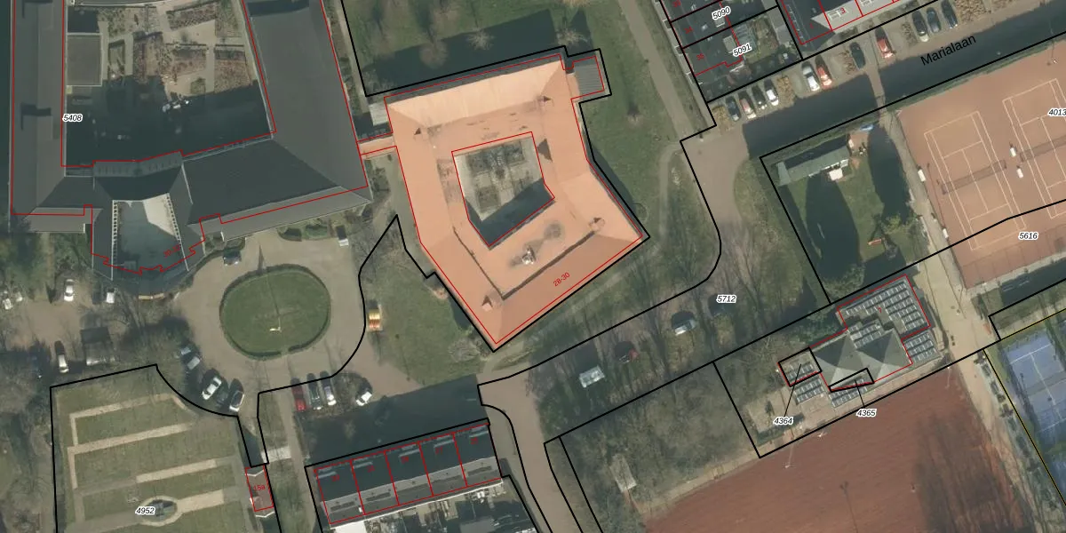 Het perceel waarop Franciscuslaan 28 staat heeft een oppervlakte van 2,3 ha. Dit is een zeer groot perceel. De perceeloppervlakte wordt geregistreerd door het Kadaster. Gedetailleerde informatie over de maten van dit perceel kunt u vinden in het rapport Kadastrale kaart met maatvoering van Franciscuslaan 28.