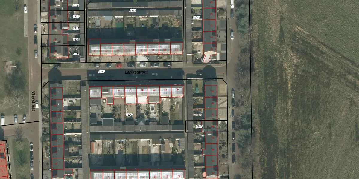 Lariksstraat 16 is gelegen op kadastraal perceel ODB02B5129. Deze kadastrale aanduiding is uniek en wordt gebruikt door het Kadaster om eigendomsrechten en andere zakelijke rechten vast te leggen. Het perceel maakt onderdeel uit van de kadastrale gemeente Oudenbosch.