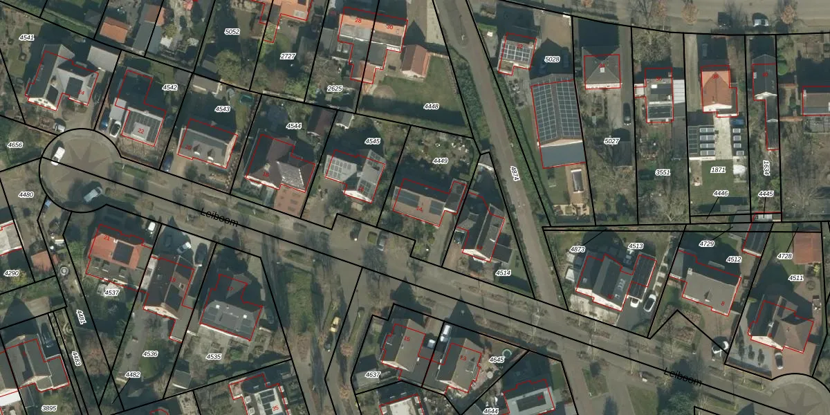 Leiboom 14 is gelegen op kadastraal perceel ODB02B4449. Deze kadastrale aanduiding is uniek en wordt gebruikt door het Kadaster om eigendomsrechten en andere zakelijke rechten vast te leggen. Het perceel maakt onderdeel uit van de kadastrale gemeente Oudenbosch.