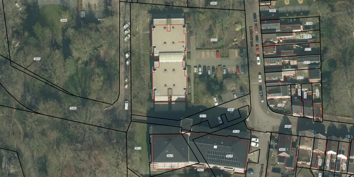 Het perceel waarop Lollestraat 16-a staat heeft een oppervlakte van 3885 m². Dit is een zeer groot perceel. De perceeloppervlakte wordt geregistreerd door het Kadaster. Gedetailleerde informatie over de maten van dit perceel kunt u vinden in het rapport Kadastrale kaart met maatvoering van Lollestraat 16-a.