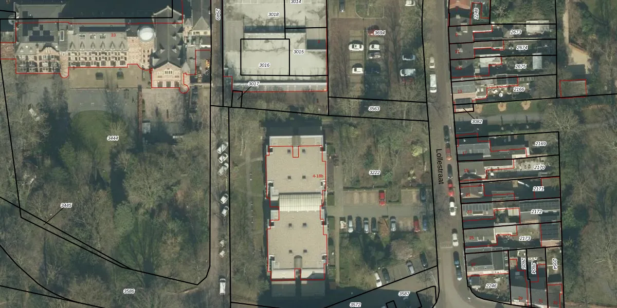 Het perceel waarop Lollestraat 4-a staat heeft een oppervlakte van 3885 m². Dit is een zeer groot perceel. De perceeloppervlakte wordt geregistreerd door het Kadaster. Gedetailleerde informatie over de maten van dit perceel kunt u vinden in het rapport Kadastrale kaart met maatvoering van Lollestraat 4-a.