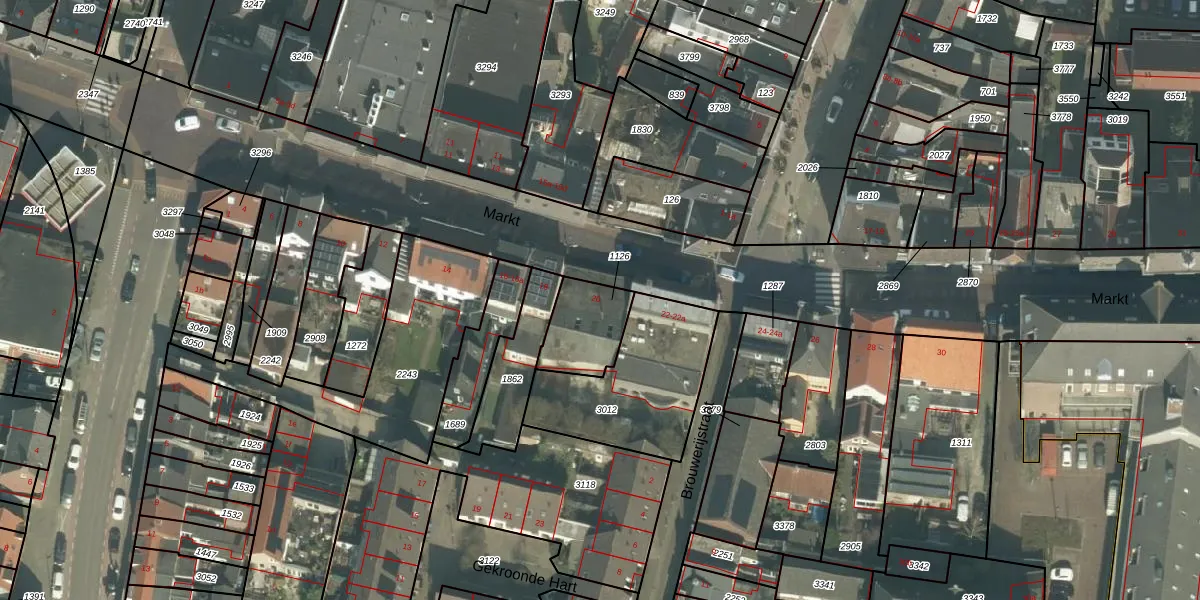 Het perceel waarop Markt 20 staat heeft een oppervlakte van 184 m². Dit is een middelgroot perceel. De perceeloppervlakte wordt geregistreerd door het Kadaster. Gedetailleerde informatie over de maten van dit perceel kunt u vinden in het rapport Kadastrale kaart met maatvoering van Markt 20.