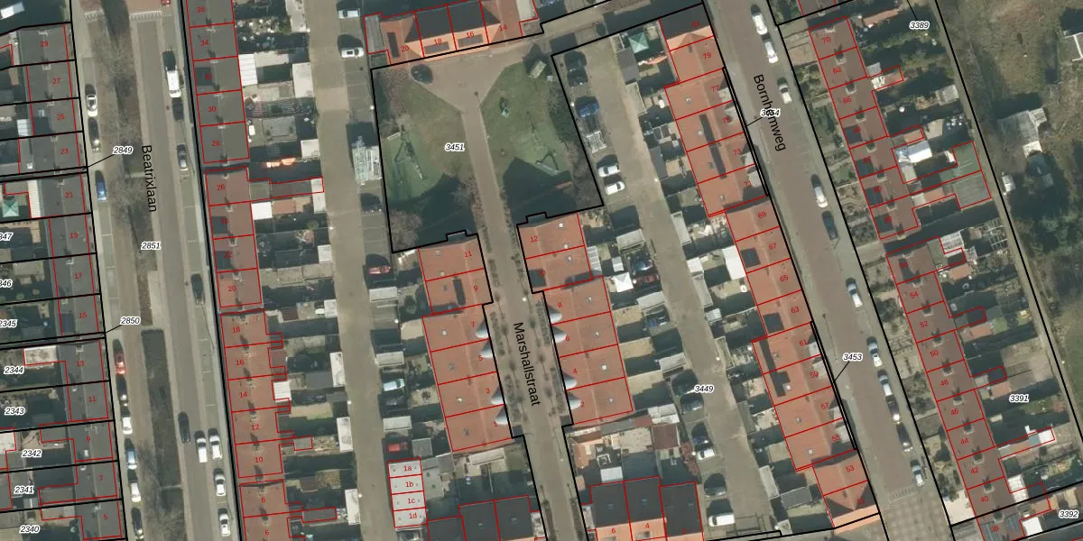Marshallstraat 10 is gelegen op kadastraal perceel ODB02D3449. Deze kadastrale aanduiding is uniek en wordt gebruikt door het Kadaster om eigendomsrechten en andere zakelijke rechten vast te leggen. Het perceel maakt onderdeel uit van de kadastrale gemeente Oudenbosch.