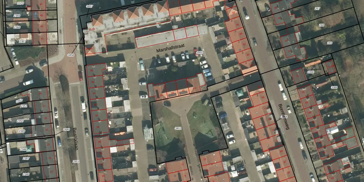 Marshallstraat 16 is gelegen op kadastraal perceel ODB02D3450. Deze kadastrale aanduiding is uniek en wordt gebruikt door het Kadaster om eigendomsrechten en andere zakelijke rechten vast te leggen. Het perceel maakt onderdeel uit van de kadastrale gemeente Oudenbosch.