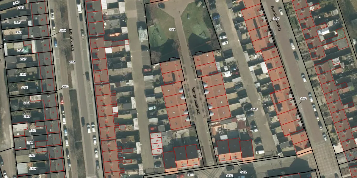 Marshallstraat 7 is gelegen op kadastraal perceel ODB02D3450. Deze kadastrale aanduiding is uniek en wordt gebruikt door het Kadaster om eigendomsrechten en andere zakelijke rechten vast te leggen. Het perceel maakt onderdeel uit van de kadastrale gemeente Oudenbosch.