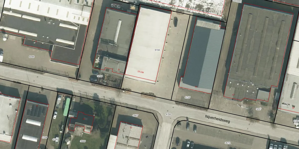 Het perceel waarop Nijverheidsweg 13-a staat heeft een oppervlakte van 2031 m². Dit is een zeer groot perceel. De perceeloppervlakte wordt geregistreerd door het Kadaster. Gedetailleerde informatie over de maten van dit perceel kunt u vinden in het rapport Kadastrale kaart met maatvoering van Nijverheidsweg 13-a.