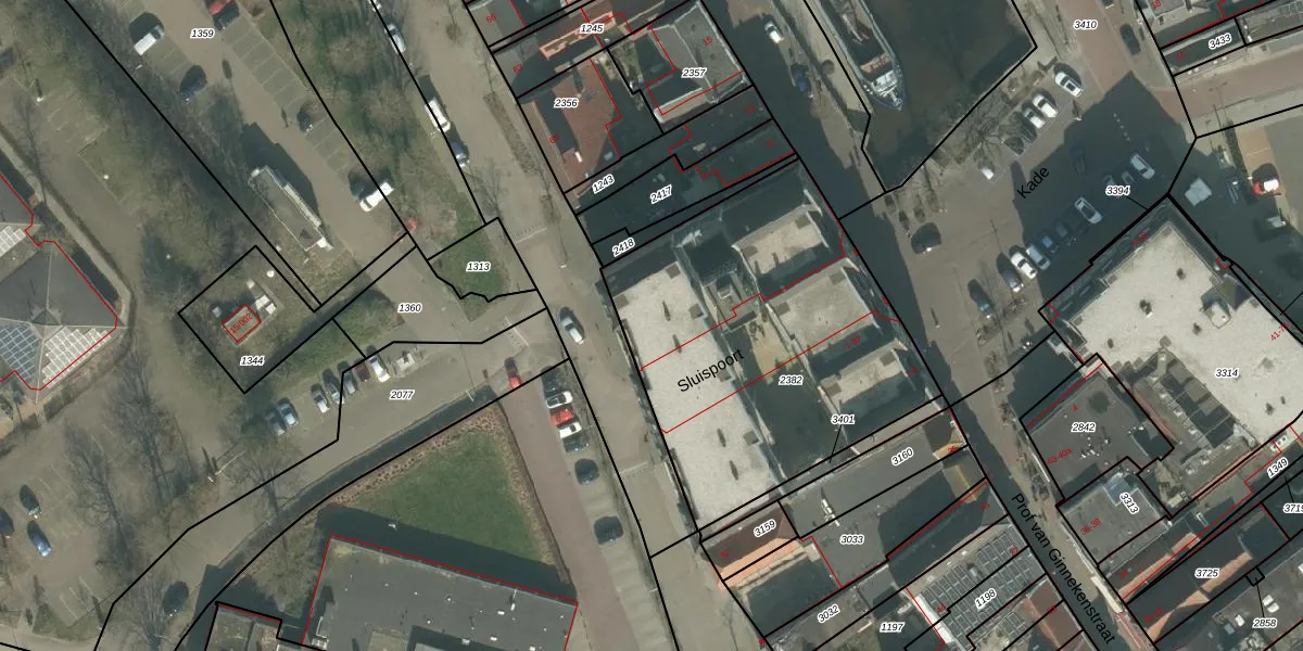 Het perceel waarop Sluispoort 19 staat heeft een oppervlakte van 1665 m². Dit is een zeer groot perceel. De perceeloppervlakte wordt geregistreerd door het Kadaster. Gedetailleerde informatie over de maten van dit perceel kunt u vinden in het rapport Kadastrale kaart met maatvoering van Sluispoort 19.