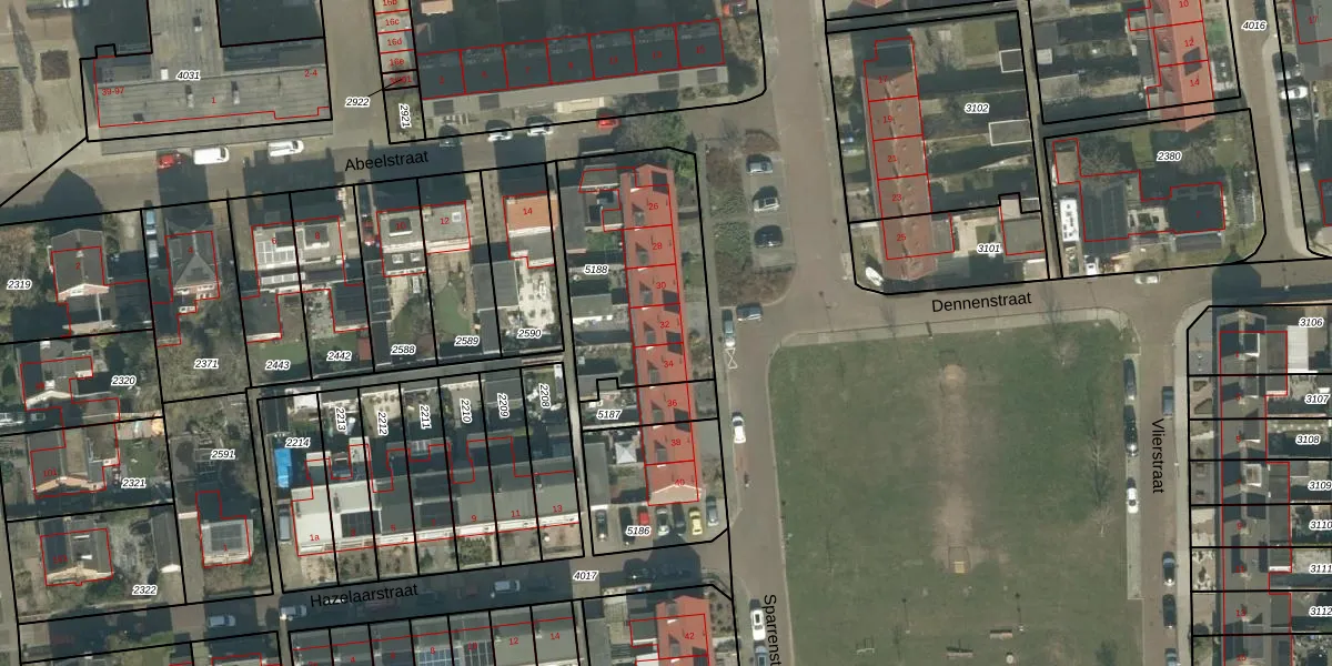 Sparrenstraat 32 is gelegen op kadastraal perceel ODB02B5188. Deze kadastrale aanduiding is uniek en wordt gebruikt door het Kadaster om eigendomsrechten en andere zakelijke rechten vast te leggen. Het perceel maakt onderdeel uit van de kadastrale gemeente Oudenbosch.