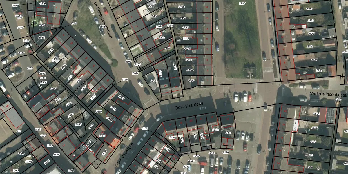 Vader Vincentiusstraat 18 is gelegen op kadastraal perceel ODB02D2465. Deze kadastrale aanduiding is uniek en wordt gebruikt door het Kadaster om eigendomsrechten en andere zakelijke rechten vast te leggen. Het perceel maakt onderdeel uit van de kadastrale gemeente Oudenbosch.