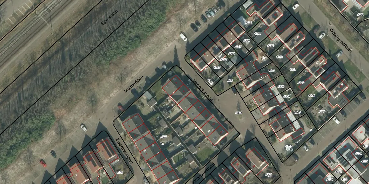 Het perceel waarop Veenpluispad 4 staat heeft een oppervlakte van 2646 m². Dit is een zeer groot perceel. De perceeloppervlakte wordt geregistreerd door het Kadaster. Gedetailleerde informatie over de maten van dit perceel kunt u vinden in het rapport Kadastrale kaart met maatvoering van Veenpluispad 4.