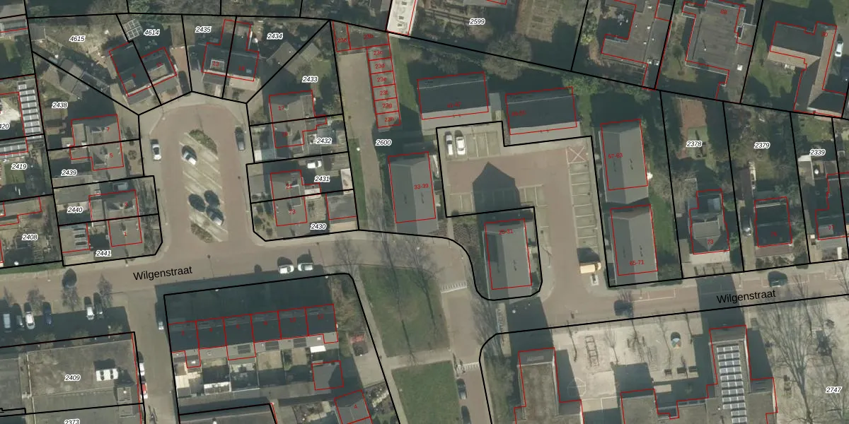 Wilgenstraat 33 is gelegen op kadastraal perceel ODB02B2600. Deze kadastrale aanduiding is uniek en wordt gebruikt door het Kadaster om eigendomsrechten en andere zakelijke rechten vast te leggen. Het perceel maakt onderdeel uit van de kadastrale gemeente Oudenbosch.