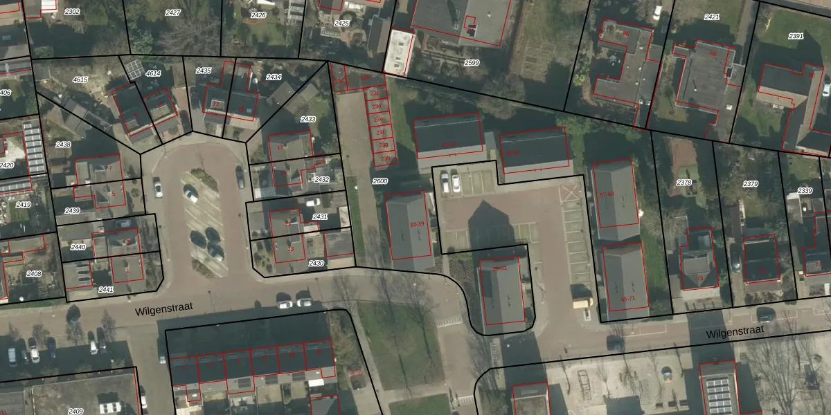 Wilgenstraat 39 is gelegen op kadastraal perceel ODB02B2600. Deze kadastrale aanduiding is uniek en wordt gebruikt door het Kadaster om eigendomsrechten en andere zakelijke rechten vast te leggen. Het perceel maakt onderdeel uit van de kadastrale gemeente Oudenbosch.