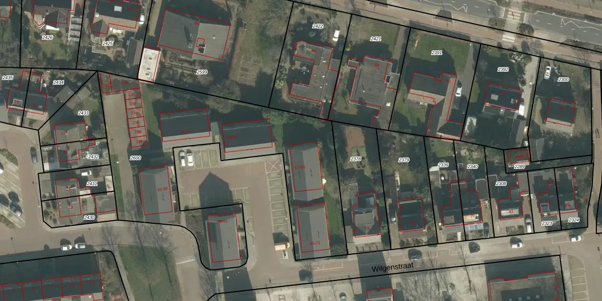 Wilgenstraat 57 is gelegen op kadastraal perceel ODB02B2600. Deze kadastrale aanduiding is uniek en wordt gebruikt door het Kadaster om eigendomsrechten en andere zakelijke rechten vast te leggen. Het perceel maakt onderdeel uit van de kadastrale gemeente Oudenbosch.