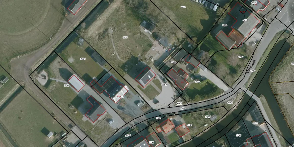 Het perceel waarop Molendijk 62 staat heeft een oppervlakte van 3575 m². Dit is een zeer groot perceel. De perceeloppervlakte wordt geregistreerd door het Kadaster. Gedetailleerde informatie over de maten van dit perceel kunt u vinden in het rapport Kadastrale kaart met maatvoering van Molendijk 62.