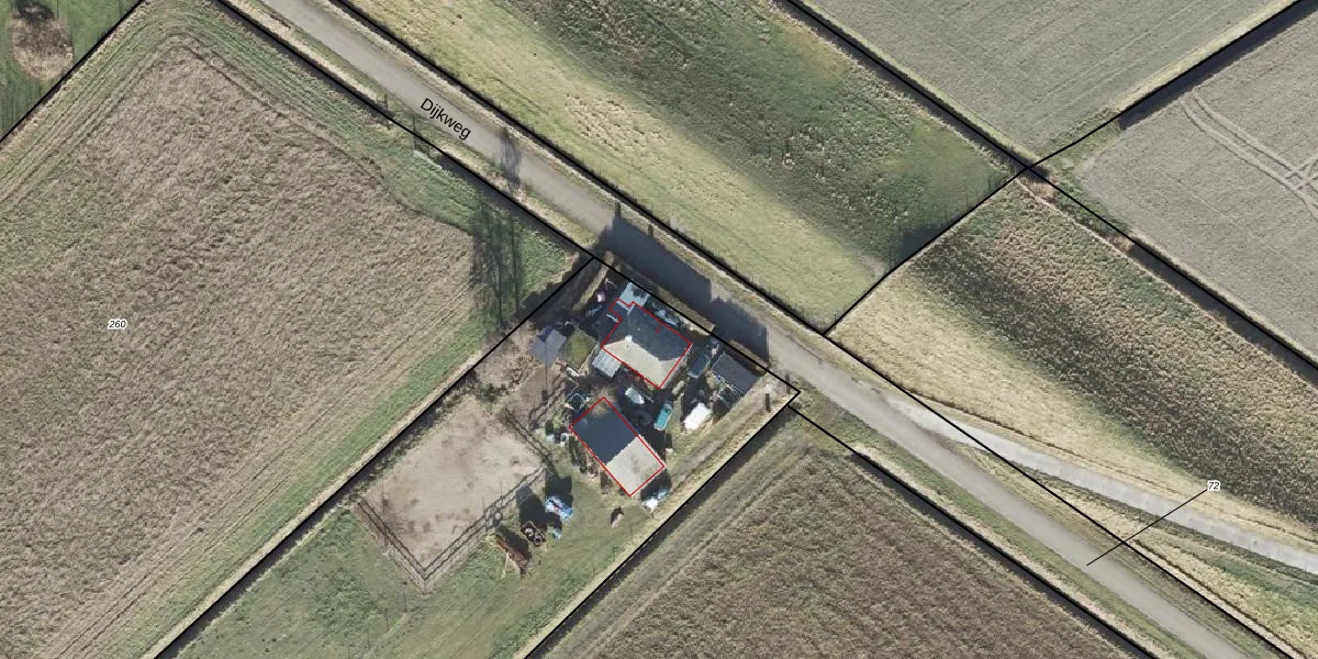 Het perceel waarop Dijkweg 1 staat heeft een oppervlakte van 4655 m². Dit is een zeer groot perceel. De perceeloppervlakte wordt geregistreerd door het Kadaster. Gedetailleerde informatie over de maten van dit perceel kunt u vinden in het rapport Kadastrale kaart met maatvoering van Dijkweg 1.