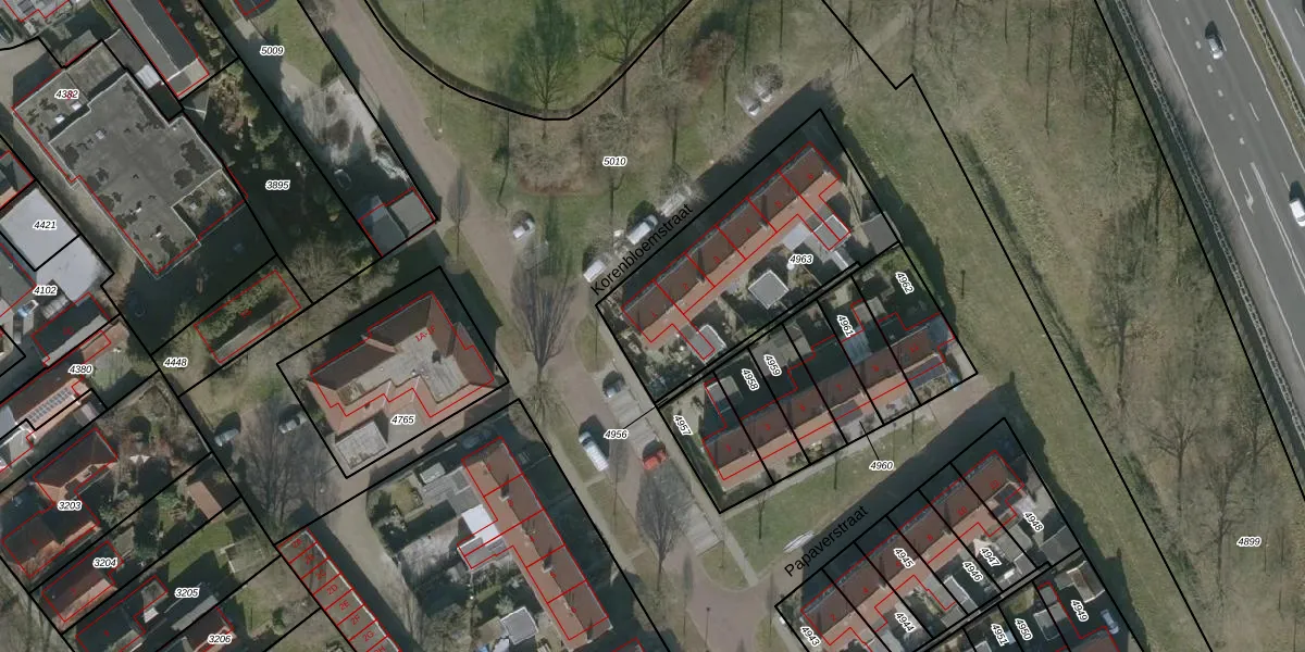 Het perceel waarop Korenbloemstraat 1 staat heeft een oppervlakte van 905 m². Dit is een groot perceel. De perceeloppervlakte wordt geregistreerd door het Kadaster. Gedetailleerde informatie over de maten van dit perceel kunt u vinden in het rapport Kadastrale kaart met maatvoering van Korenbloemstraat 1.