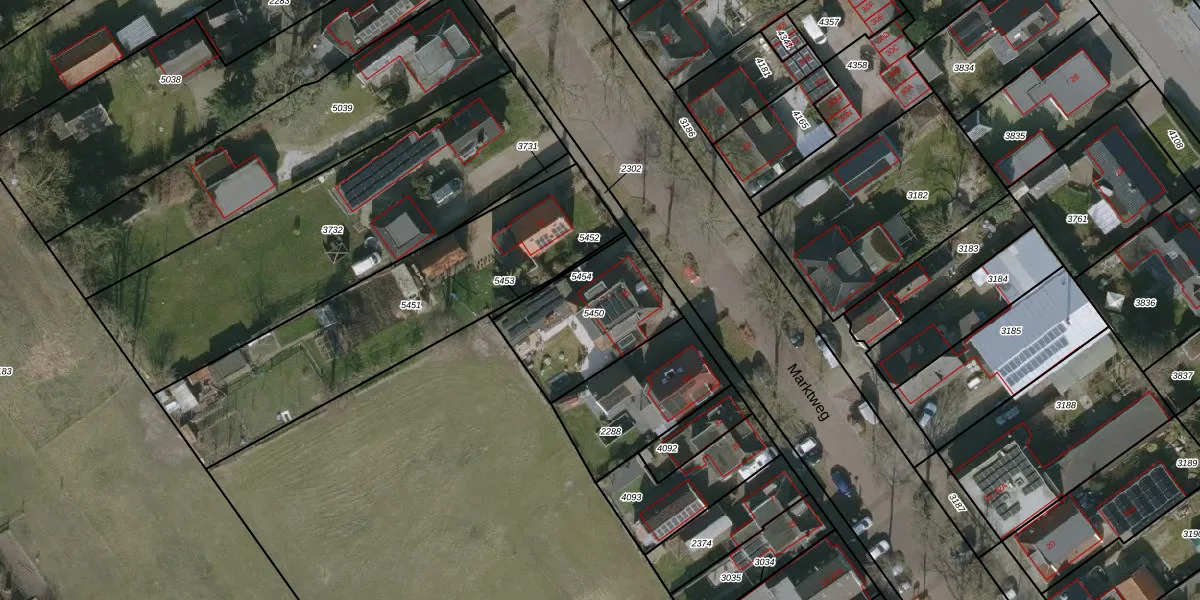 Het perceel waarop Marktweg 35 staat heeft een oppervlakte van 447 m². Dit is een groot perceel. De perceeloppervlakte wordt geregistreerd door het Kadaster. Gedetailleerde informatie over de maten van dit perceel kunt u vinden in het rapport Kadastrale kaart met maatvoering van Marktweg 35.