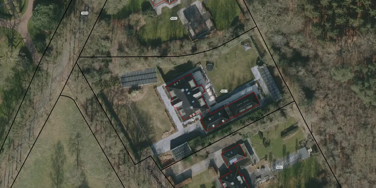 Het perceel waarop Schotertuinen 2 staat heeft een oppervlakte van 4880 m². Dit is een zeer groot perceel. De perceeloppervlakte wordt geregistreerd door het Kadaster. Gedetailleerde informatie over de maten van dit perceel kunt u vinden in het rapport Kadastrale kaart met maatvoering van Schotertuinen 2.