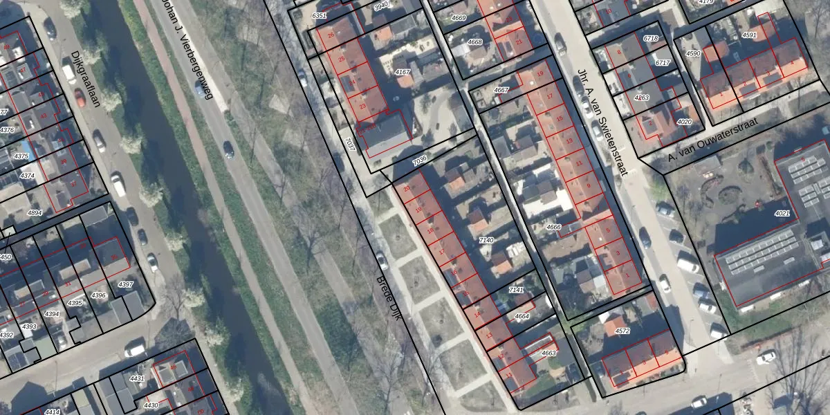 Brede Dijk 19 is gelegen op kadastraal perceel ODW00B7140. Deze kadastrale aanduiding is uniek en wordt gebruikt door het Kadaster om eigendomsrechten en andere zakelijke rechten vast te leggen. Het perceel maakt onderdeel uit van de kadastrale gemeente Oudewater.