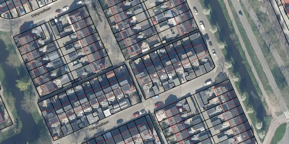 Dijkgraaflaan 21 is gelegen op kadastraal perceel ODW00B4390. Deze kadastrale aanduiding is uniek en wordt gebruikt door het Kadaster om eigendomsrechten en andere zakelijke rechten vast te leggen. Het perceel maakt onderdeel uit van de kadastrale gemeente Oudewater.