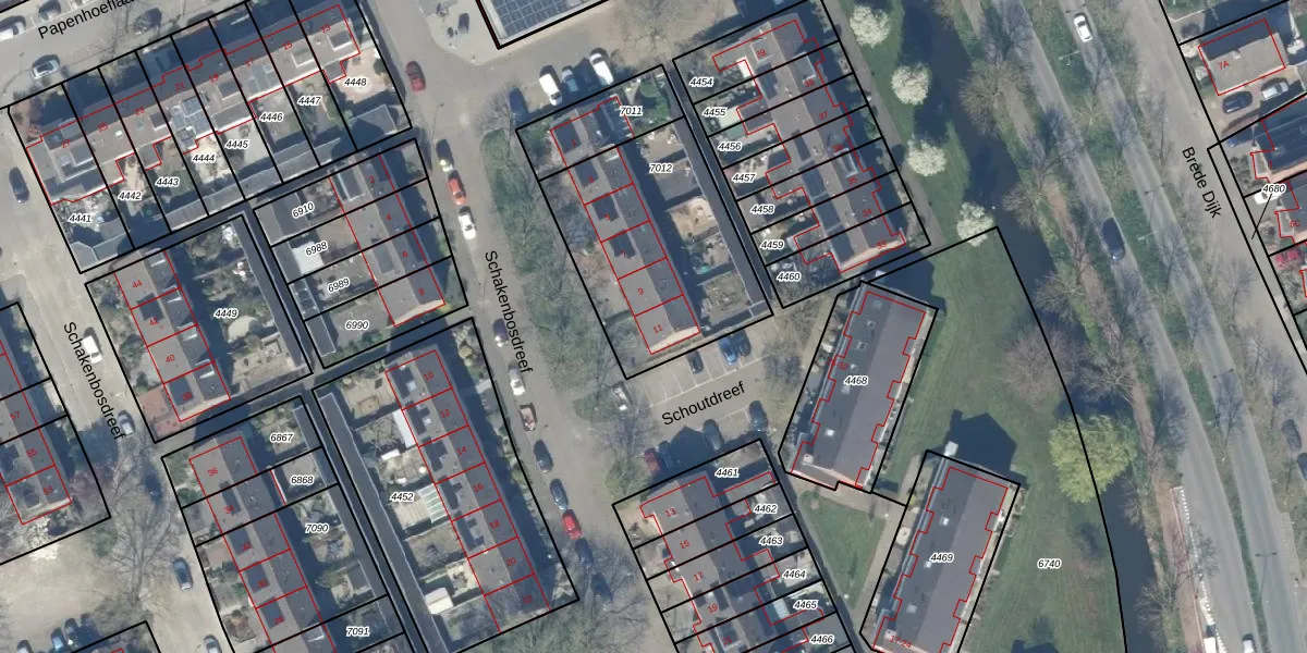 Schakenbosdreef 11 is gelegen op kadastraal perceel ODW00B7012. Deze kadastrale aanduiding is uniek en wordt gebruikt door het Kadaster om eigendomsrechten en andere zakelijke rechten vast te leggen. Het perceel maakt onderdeel uit van de kadastrale gemeente Oudewater.