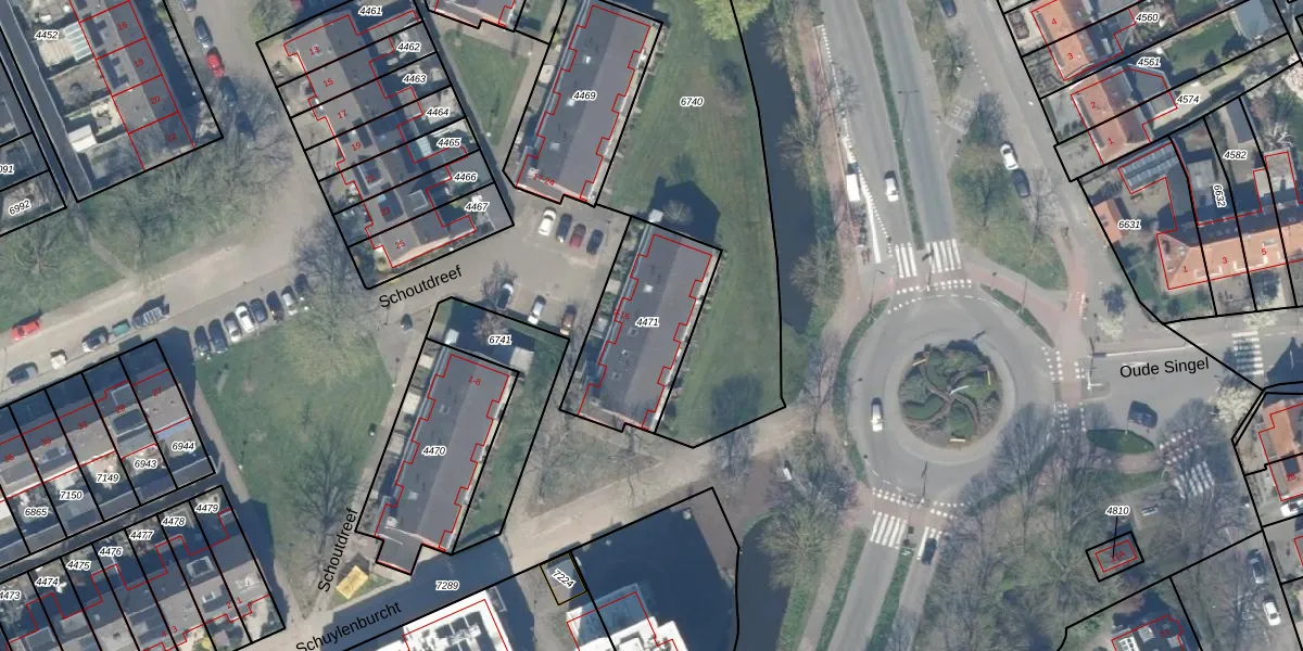 Schoutdreef 13 is gelegen op kadastraal perceel ODW00B4471. Deze kadastrale aanduiding is uniek en wordt gebruikt door het Kadaster om eigendomsrechten en andere zakelijke rechten vast te leggen. Het perceel maakt onderdeel uit van de kadastrale gemeente Oudewater.