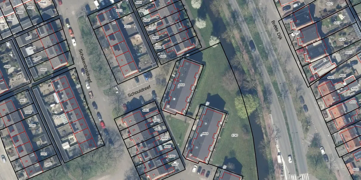 Schoutdreef 28 is gelegen op kadastraal perceel ODW00B4468. Deze kadastrale aanduiding is uniek en wordt gebruikt door het Kadaster om eigendomsrechten en andere zakelijke rechten vast te leggen. Het perceel maakt onderdeel uit van de kadastrale gemeente Oudewater.