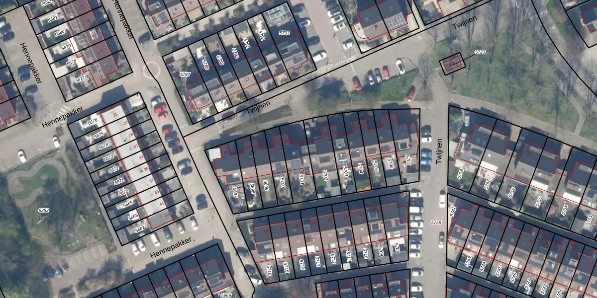 Twijnen 28 is gelegen op kadastraal perceel ODW00B5701. Deze kadastrale aanduiding is uniek en wordt gebruikt door het Kadaster om eigendomsrechten en andere zakelijke rechten vast te leggen. Het perceel maakt onderdeel uit van de kadastrale gemeente Oudewater.