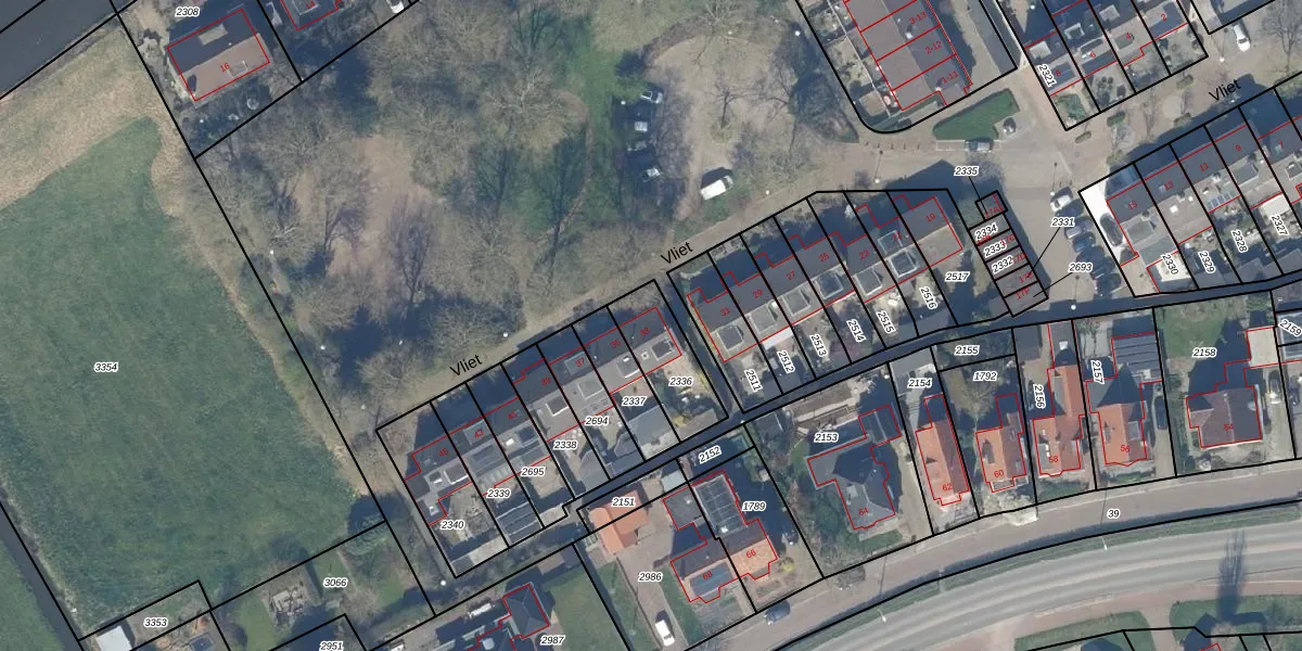 Het perceel waarop Vliet 33 staat heeft een oppervlakte van 196 m². Dit is een middelgroot perceel. De perceeloppervlakte wordt geregistreerd door het Kadaster. Gedetailleerde informatie over de maten van dit perceel kunt u vinden in het rapport Kadastrale kaart met maatvoering van Vliet 33.