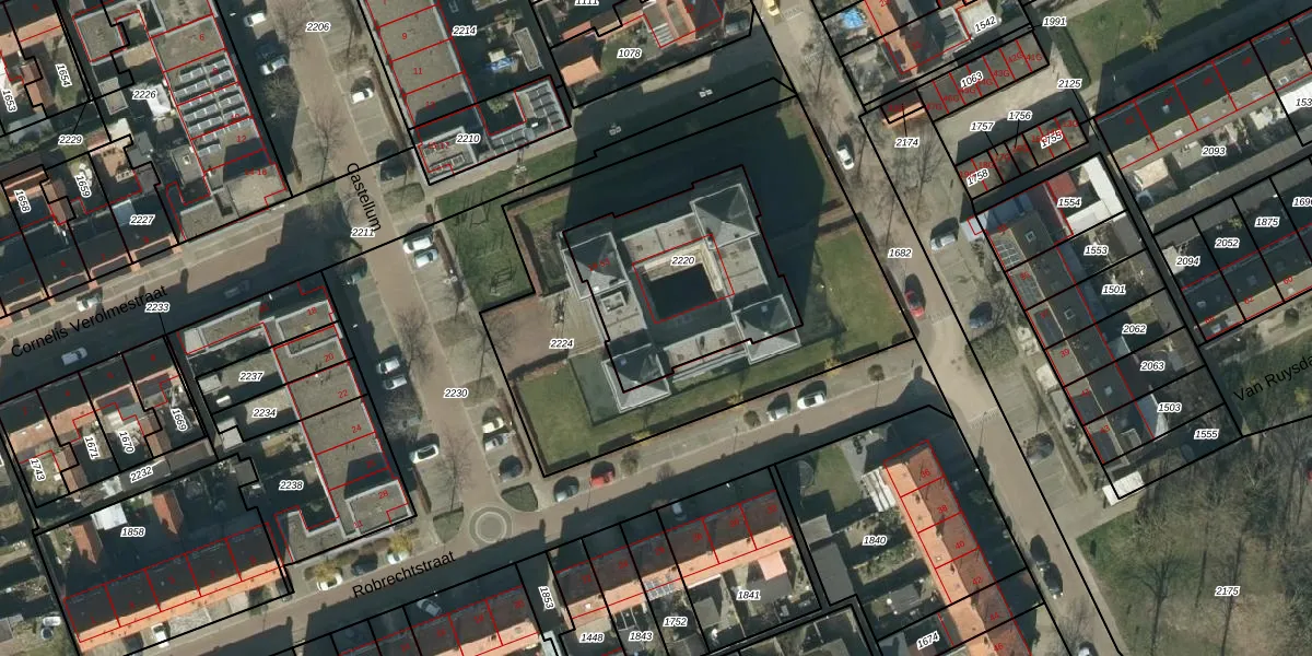 Het perceel waarop Castellum 35 staat heeft een oppervlakte van 726 m². Dit is een groot perceel. De perceeloppervlakte wordt geregistreerd door het Kadaster. Gedetailleerde informatie over de maten van dit perceel kunt u vinden in het rapport Kadastrale kaart met maatvoering van Castellum 35.