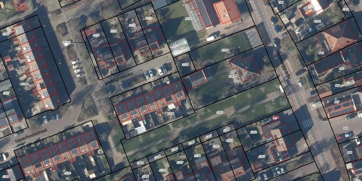 Het perceel waarop Veilingmeester 14 staat heeft een oppervlakte van 1084 m². Dit is een zeer groot perceel. De perceeloppervlakte wordt geregistreerd door het Kadaster. Gedetailleerde informatie over de maten van dit perceel kunt u vinden in het rapport Kadastrale kaart met maatvoering van Veilingmeester 14.