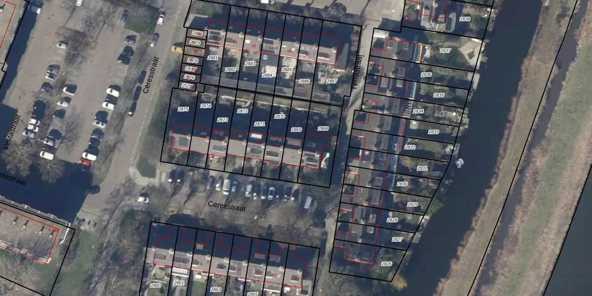 Het perceel waarop Ceresstraat 20 staat heeft een oppervlakte van 176 m². Dit is een middelgroot perceel. De perceeloppervlakte wordt geregistreerd door het Kadaster. Gedetailleerde informatie over de maten van dit perceel kunt u vinden in het rapport Kadastrale kaart met maatvoering van Ceresstraat 20.