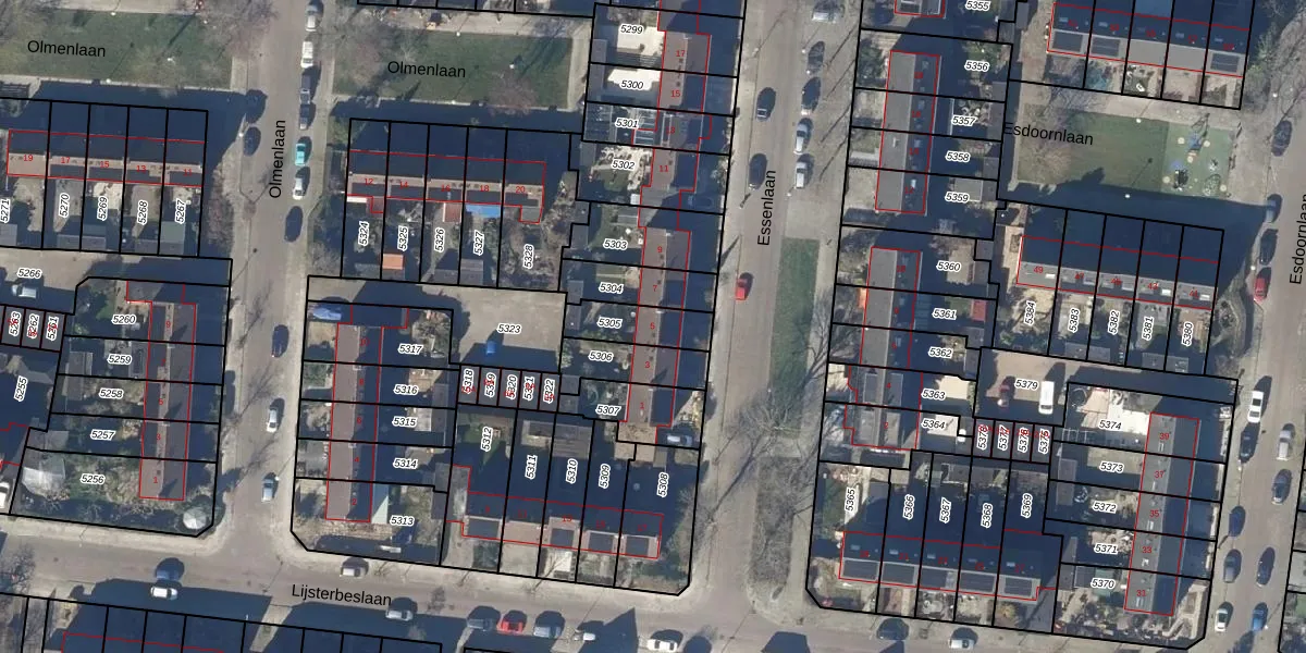 Essenlaan 5 is gelegen op kadastraal perceel ODP02A5305. Deze kadastrale aanduiding is uniek en wordt gebruikt door het Kadaster om eigendomsrechten en andere zakelijke rechten vast te leggen. Het perceel maakt onderdeel uit van de kadastrale gemeente Oudorp.