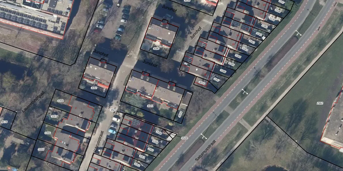 Het perceel waarop Junohof 32 staat heeft een oppervlakte van 657 m². Dit is een groot perceel. De perceeloppervlakte wordt geregistreerd door het Kadaster. Gedetailleerde informatie over de maten van dit perceel kunt u vinden in het rapport Kadastrale kaart met maatvoering van Junohof 32.