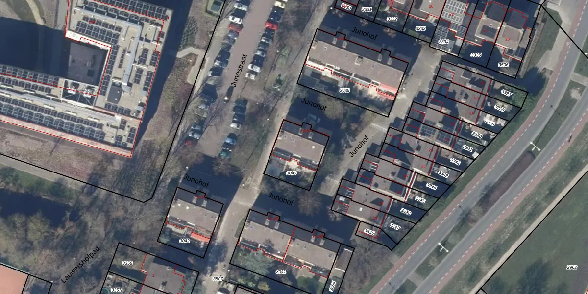 Het perceel waarop Junohof 61 staat heeft een oppervlakte van 333 m². Dit is een groot perceel. De perceeloppervlakte wordt geregistreerd door het Kadaster. Gedetailleerde informatie over de maten van dit perceel kunt u vinden in het rapport Kadastrale kaart met maatvoering van Junohof 61.