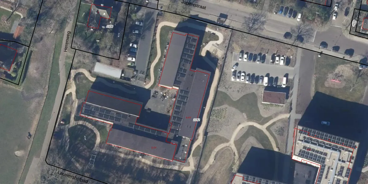 Het perceel waarop Jupiterstraat 4-S staat heeft een oppervlakte van 1,7 ha. Dit is een zeer groot perceel. De perceeloppervlakte wordt geregistreerd door het Kadaster. Gedetailleerde informatie over de maten van dit perceel kunt u vinden in het rapport Kadastrale kaart met maatvoering van Jupiterstraat 4-S.
