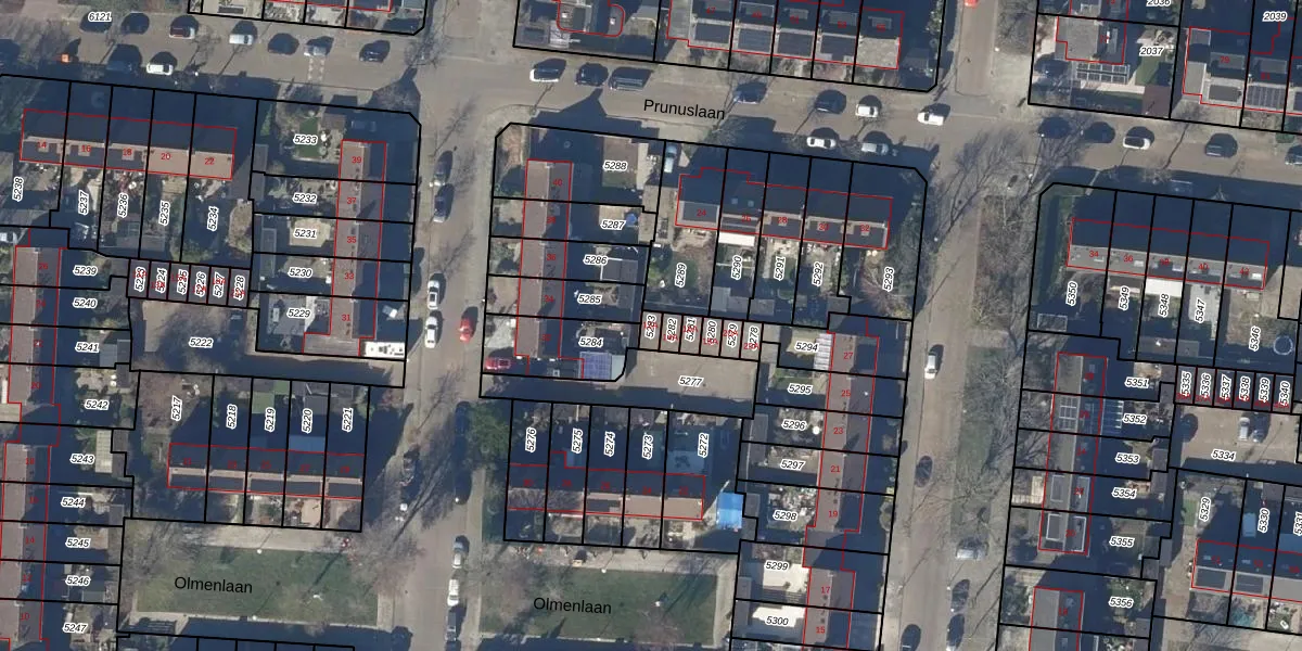 Het perceel waarop Olmenlaan 12-A staat heeft een oppervlakte van 19 m². Dit is een klein perceel. De perceeloppervlakte wordt geregistreerd door het Kadaster. Gedetailleerde informatie over de maten van dit perceel kunt u vinden in het rapport Kadastrale kaart met maatvoering van Olmenlaan 12-A.