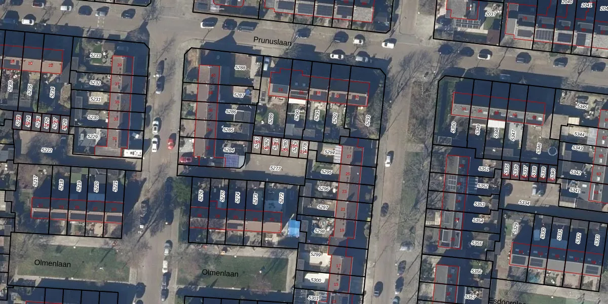 Het perceel waarop Olmenlaan 22-A staat heeft een oppervlakte van 19 m². Dit is een klein perceel. De perceeloppervlakte wordt geregistreerd door het Kadaster. Gedetailleerde informatie over de maten van dit perceel kunt u vinden in het rapport Kadastrale kaart met maatvoering van Olmenlaan 22-A.