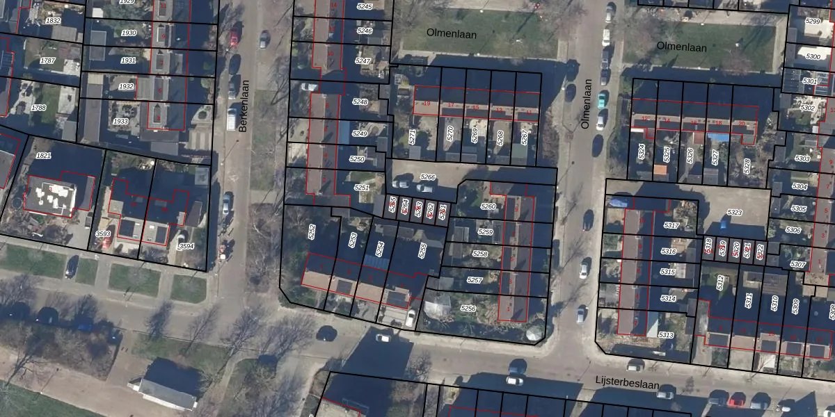 Het perceel waarop Olmenlaan 5-A staat heeft een oppervlakte van 18 m². Dit is een klein perceel. De perceeloppervlakte wordt geregistreerd door het Kadaster. Gedetailleerde informatie over de maten van dit perceel kunt u vinden in het rapport Kadastrale kaart met maatvoering van Olmenlaan 5-A.