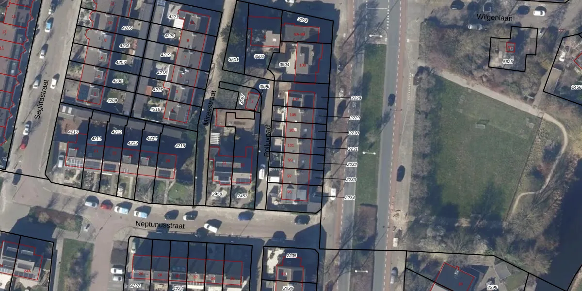 Gebruik de zoekbalk of klik op een perceel voor informatie over de adressen binnen dit perceel.