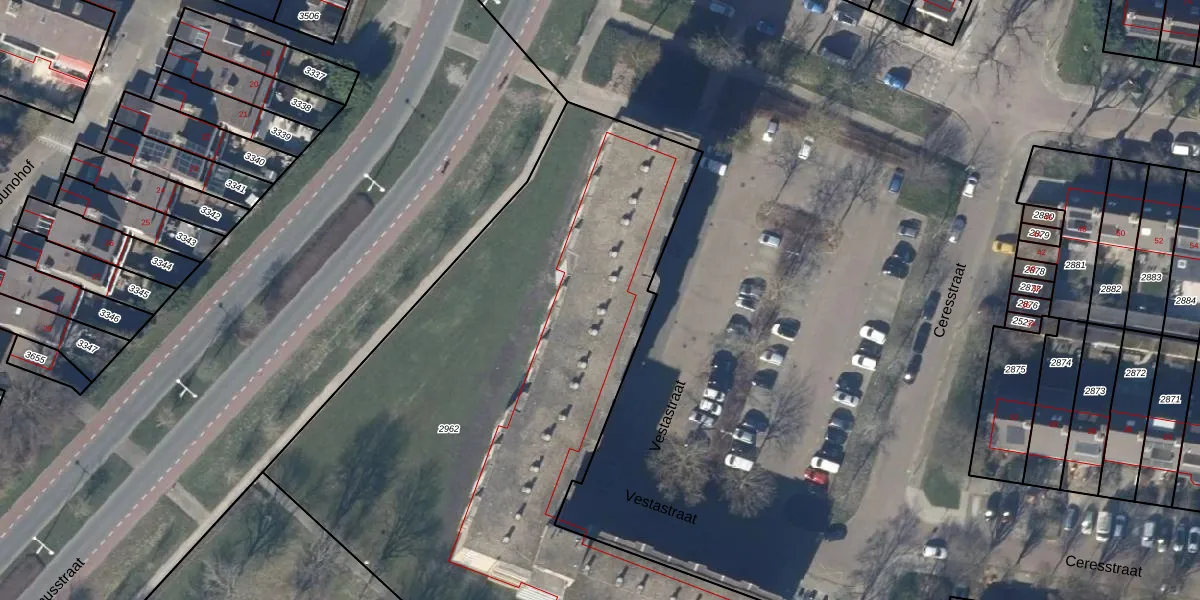 Het perceel waarop Vestastraat 104 staat heeft een oppervlakte van 4063 m². Dit is een zeer groot perceel. De perceeloppervlakte wordt geregistreerd door het Kadaster. Gedetailleerde informatie over de maten van dit perceel kunt u vinden in het rapport Kadastrale kaart met maatvoering van Vestastraat 104.