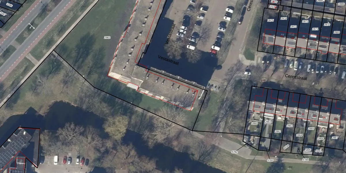 Het perceel waarop Vestastraat 24 staat heeft een oppervlakte van 4063 m². Dit is een zeer groot perceel. De perceeloppervlakte wordt geregistreerd door het Kadaster. Gedetailleerde informatie over de maten van dit perceel kunt u vinden in het rapport Kadastrale kaart met maatvoering van Vestastraat 24.