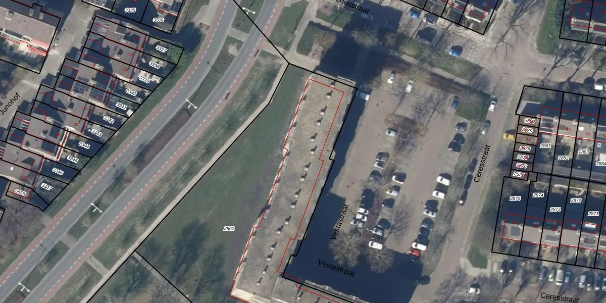 Het perceel waarop Vestastraat 61 staat heeft een oppervlakte van 4063 m². Dit is een zeer groot perceel. De perceeloppervlakte wordt geregistreerd door het Kadaster. Gedetailleerde informatie over de maten van dit perceel kunt u vinden in het rapport Kadastrale kaart met maatvoering van Vestastraat 61.