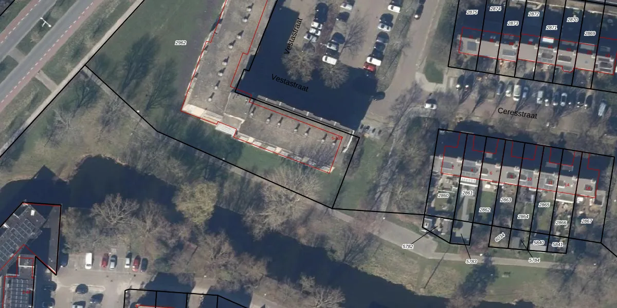 Het perceel waarop Vestastraat 67 staat heeft een oppervlakte van 4063 m². Dit is een zeer groot perceel. De perceeloppervlakte wordt geregistreerd door het Kadaster. Gedetailleerde informatie over de maten van dit perceel kunt u vinden in het rapport Kadastrale kaart met maatvoering van Vestastraat 67.