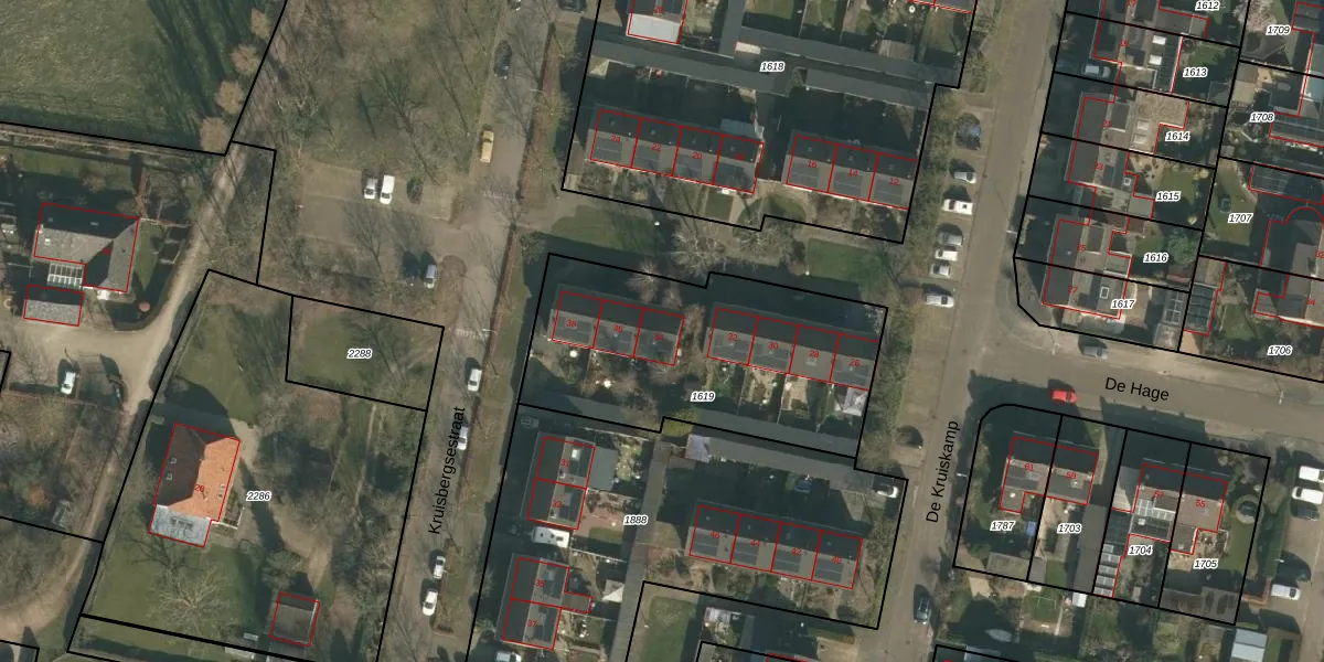 Het perceel waarop De Kruiskamp 34 staat heeft een oppervlakte van 1185 m². Dit is een zeer groot perceel. De perceeloppervlakte wordt geregistreerd door het Kadaster. Gedetailleerde informatie over de maten van dit perceel kunt u vinden in het rapport Kadastrale kaart met maatvoering van De Kruiskamp 34.