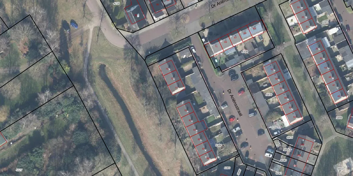 Het perceel waarop Dr Ariënsstraat 77 staat heeft een oppervlakte van 1785 m². Dit is een zeer groot perceel. De perceeloppervlakte wordt geregistreerd door het Kadaster. Gedetailleerde informatie over de maten van dit perceel kunt u vinden in het rapport Kadastrale kaart met maatvoering van Dr Ariënsstraat 77.